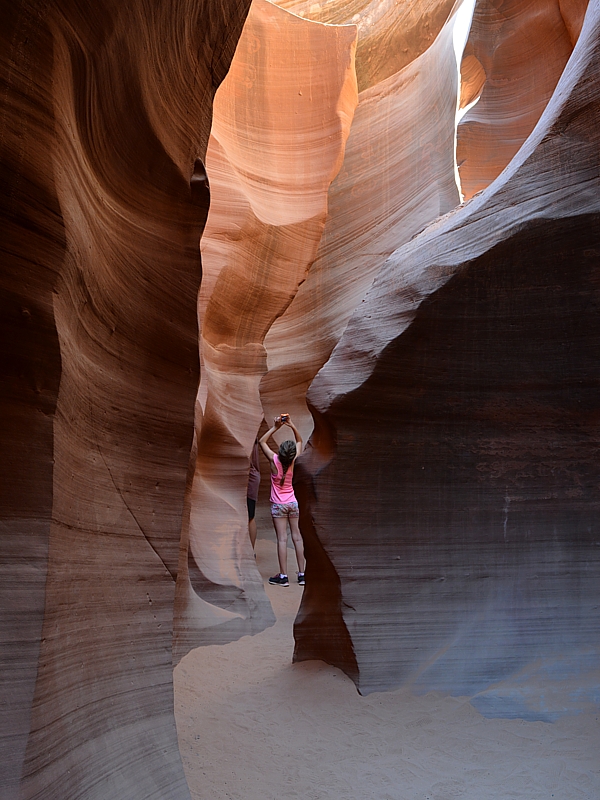 Antelope Canyon bestaat eigenlijk uit twee canyons: de Upper en de Lower Antelope Canyon. Het zijn beide slot canyons ofwel zeer smalle kloven. De Upper is 90 meter en de Lower 400 meter lang. Beide zijn super-fotogeniek. Je ziet foto's van Antelope Canyon dan ook overal terug. Door de lichtval kleuren de zandsteenrotsen prachtig oranje. Tenminste zo zie je het op de foto's. Dat heeft veel te maken met de witbalans. Zelf beleef je de kleur lang niet zo mooi.