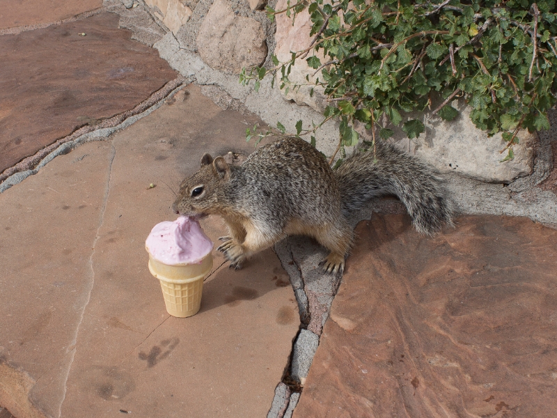 Een rotsgrondeekhoorn heeft een ijsje veroverd op een bange toerist.