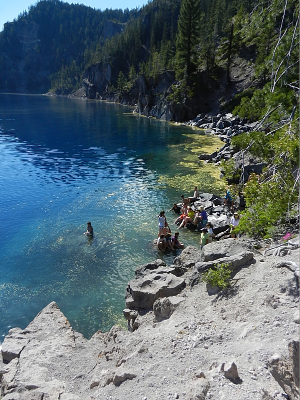 Bij Cleetwood (noordzijde Rim Drive) kun je vanaf de kraterrand naar het meer (Cleetwood Cove) toelopen. Het is een redelijk pittige wandeling, maar zeer de moeite waard! Vanaf Cleetwood Cove vertrekken van half juni / begin juli bootjes die je naar Wizard Island kunnen brengen. Zo'n boottochtje kost uiteraard geld. Neem ook je zwembroek mee. Bij Cleetwood Cove kun je zwemmen en van een klif afduiken. Het water is koud, maar zwemmen in het glasheldere water is een unieke ervaring.
