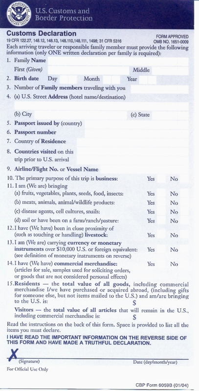 en het ingevulde Customs Declaration Form inleveren. Bij een tussenlanding in de VS moet je je koffer/rugzak ophalen, laten nakijken